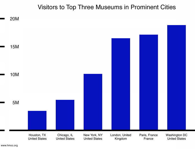 Most of the important cities of the world have three or more major museums. In the top cities, the museums attract more than 2 million visitors each. It appears that for the top cities, additional major museums result in exponential growth in visitation of the museums and other cultural resources. Support for the largest museums in cities with three or more major museums is largely generated from visitors who come from outside the cities.