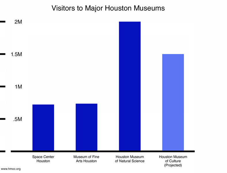 The above graph represents visitors to the three most visited Houston museums, compared with projected visitors to the Houston Museum of Culture (represented with light blue) in its first year of full operation as a museum. The Houston Museum of Culture will help Houston achieve visitor numbers similar to Chicago and will benefit all of Houston’s museums and cultural resources.